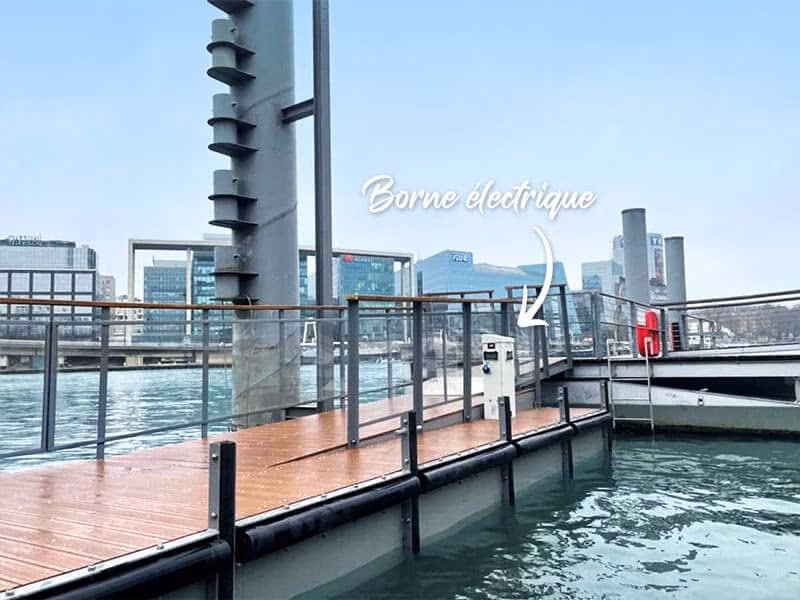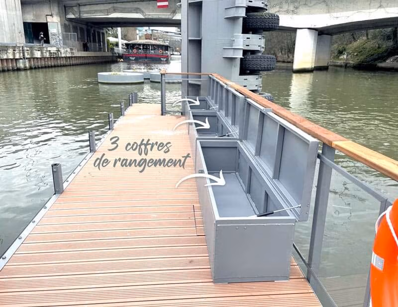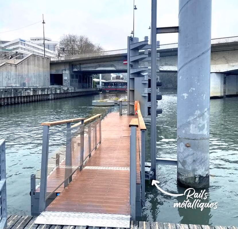 Conçu dans nos ateliers dans le 77 et installé par nos équipes, ce ponton flottant s’adapte aux niveaux de la Seine, guidé par des rails métalliques.
