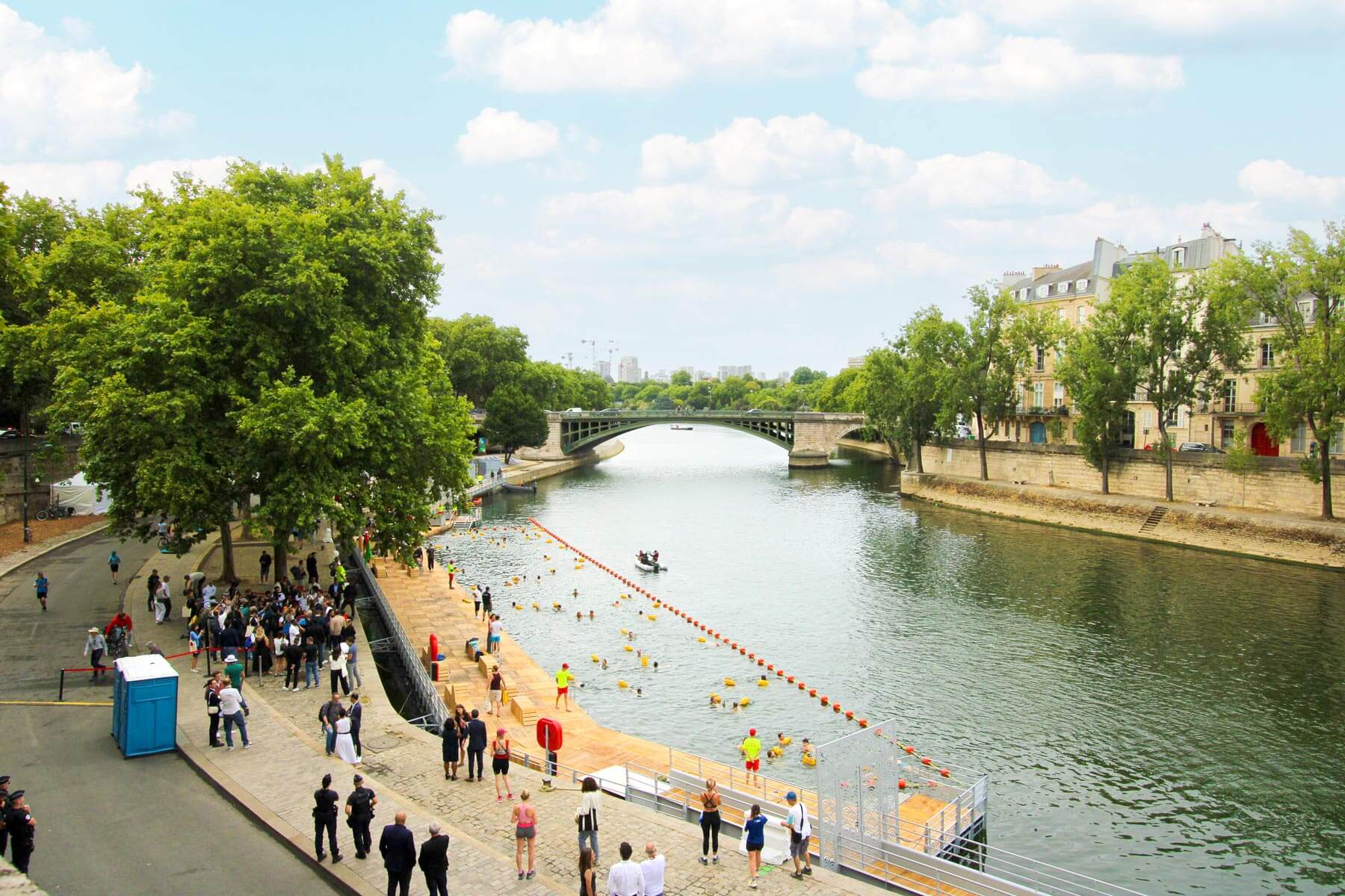 Located between the Pont de Sully and the Pont Marie, on the secondary branch of the Seine, this new swimming area enhances the Paris Plages initiative.