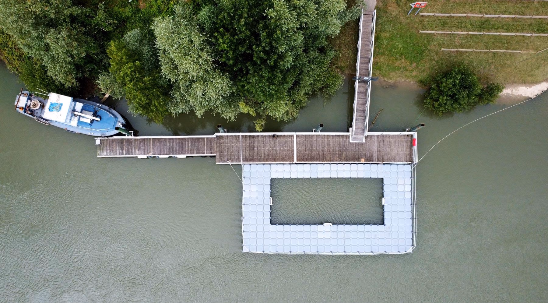 Hansen Marine y a conçu et installé l’ensemble des ouvrages flottants : deux bassins, dont une pataugeoire de 200 m² et un bassin profond de 863 m², 650 m² de pontons, passerelles articulées et équipements PMR. Un aménagement durable, sécurisé et intégré à son environnement naturel.