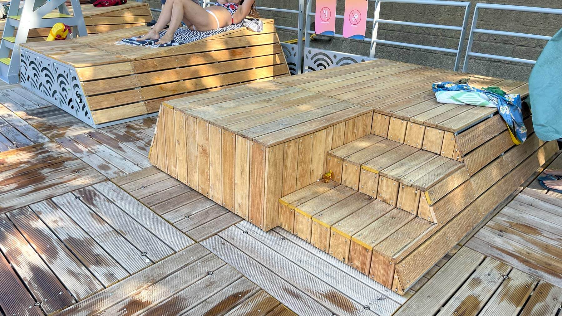 Il comprend un bassin peu profond avec un fond en caillebotis pour les plus petits, ainsi qu’un bassin plus profond accessible par deux passerelles à chaque extrémité, longé par 56 mètres de pontons flottants.