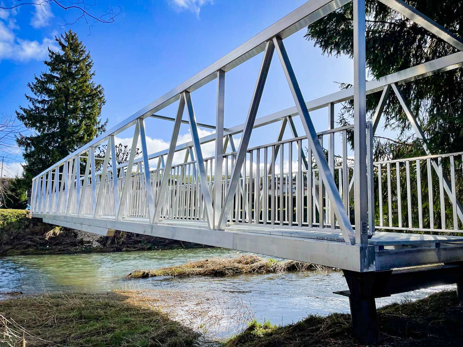 D’une longueur de 26 mètres pour 2 mètres de large, cette passerelle en aluminium offre une solution à la fois durable et adaptée aux usages quotidiens. Elle est équipée de garde-corps type S8 à barreaudage vertical, garantissant un haut niveau de sécurité pour les usagers.