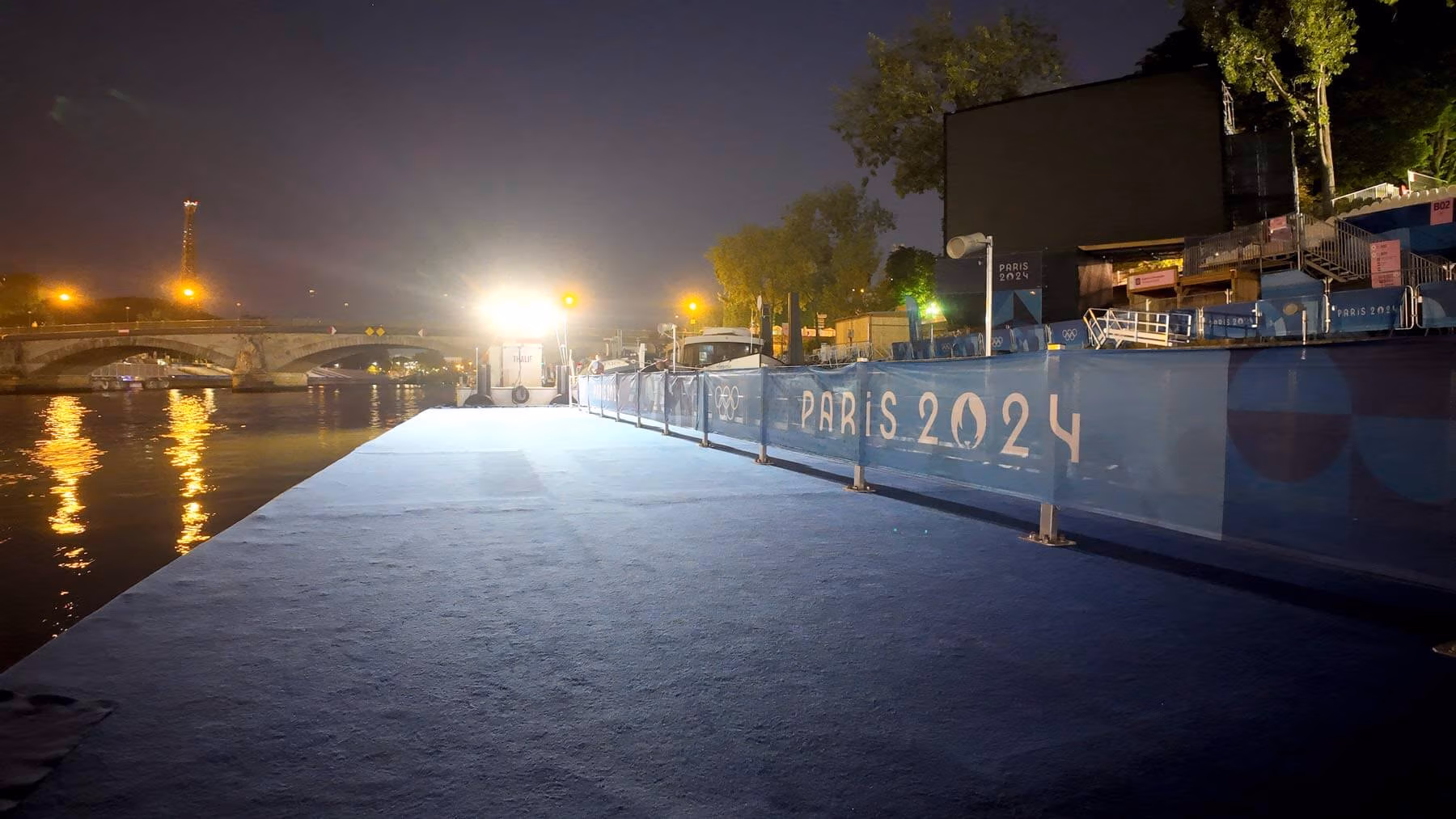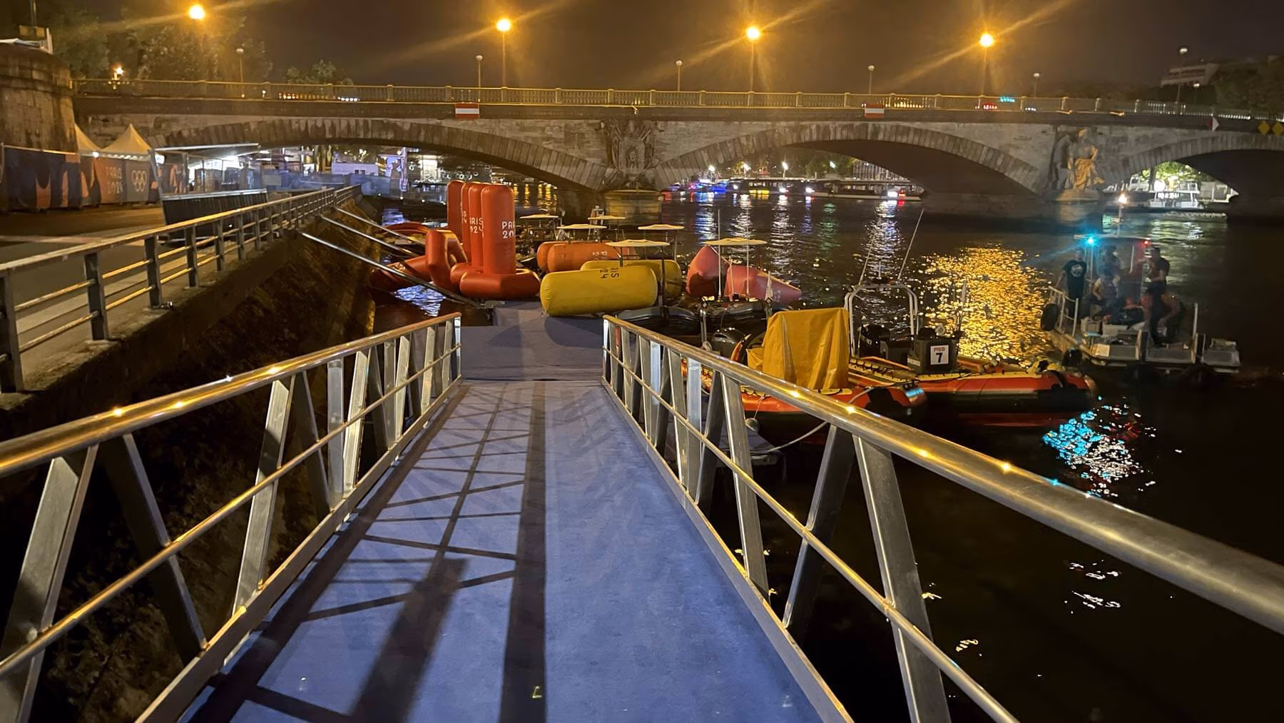Chaque nuit, nos équipes et partenaires ont orchestré le déplacement des pontons stockés à quai. Grâce à des pousseurs, les pontons ont été acheminés et assemblés pour rejoindre les deux passerelles situées de part et d’autre du quai. En à peine une heure, le ponton de départ était prêt à accueillir les athlètes.
